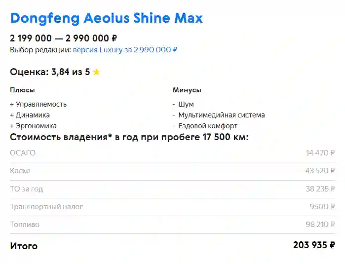 А самое интересное во всём этом, собственно, прайс. Рекомендованная цена на DONGFENG Aeolus Shine Max Comfort — 2 199 000 рублей, версия Premium на 200 тысяч дороже, 2 399 000 рублей. Шаг к комплектации Luxury ожидаемо шире, её официальный ценник — 2 990 000 рублей.